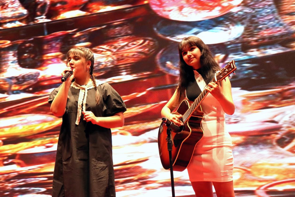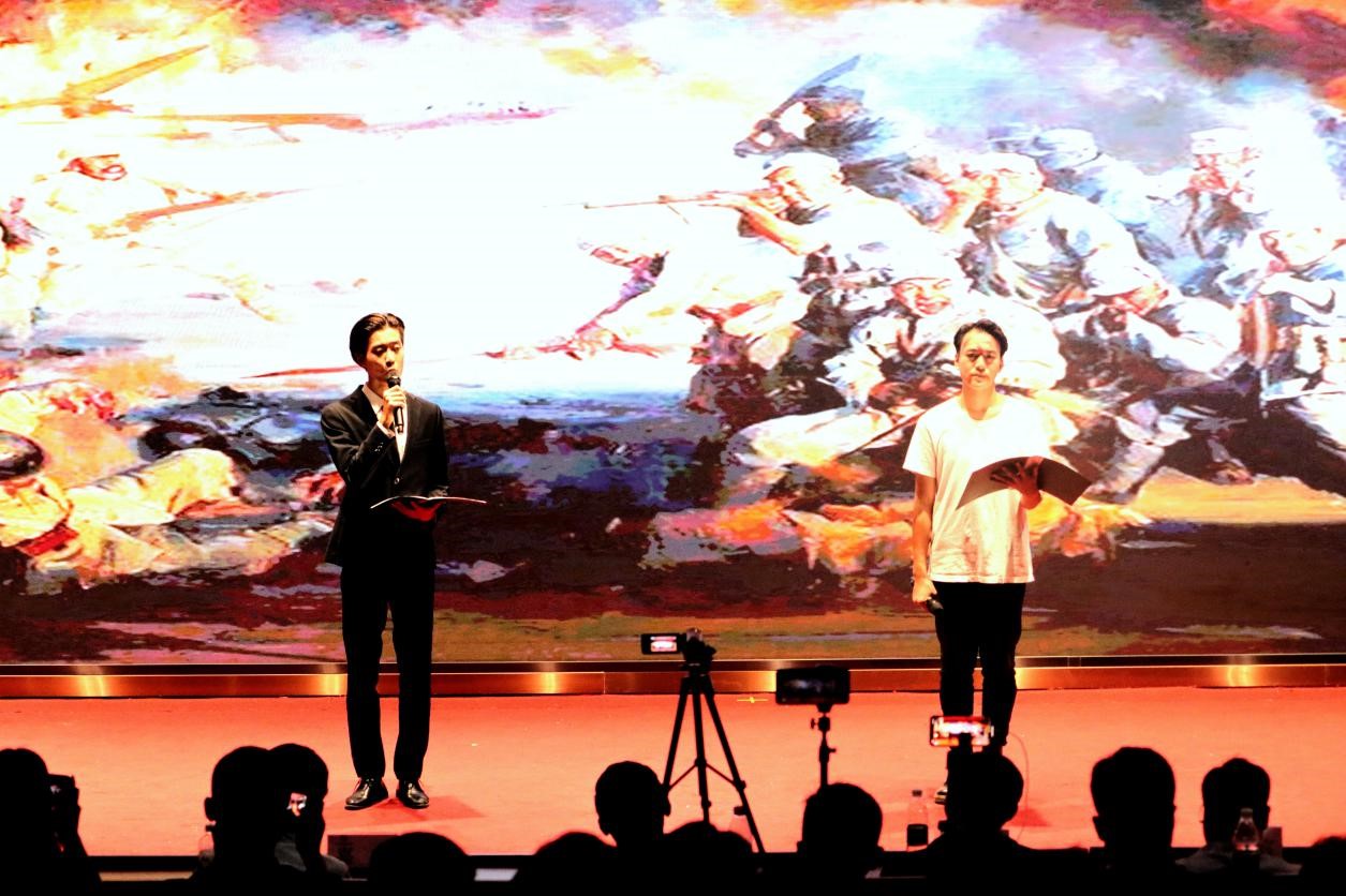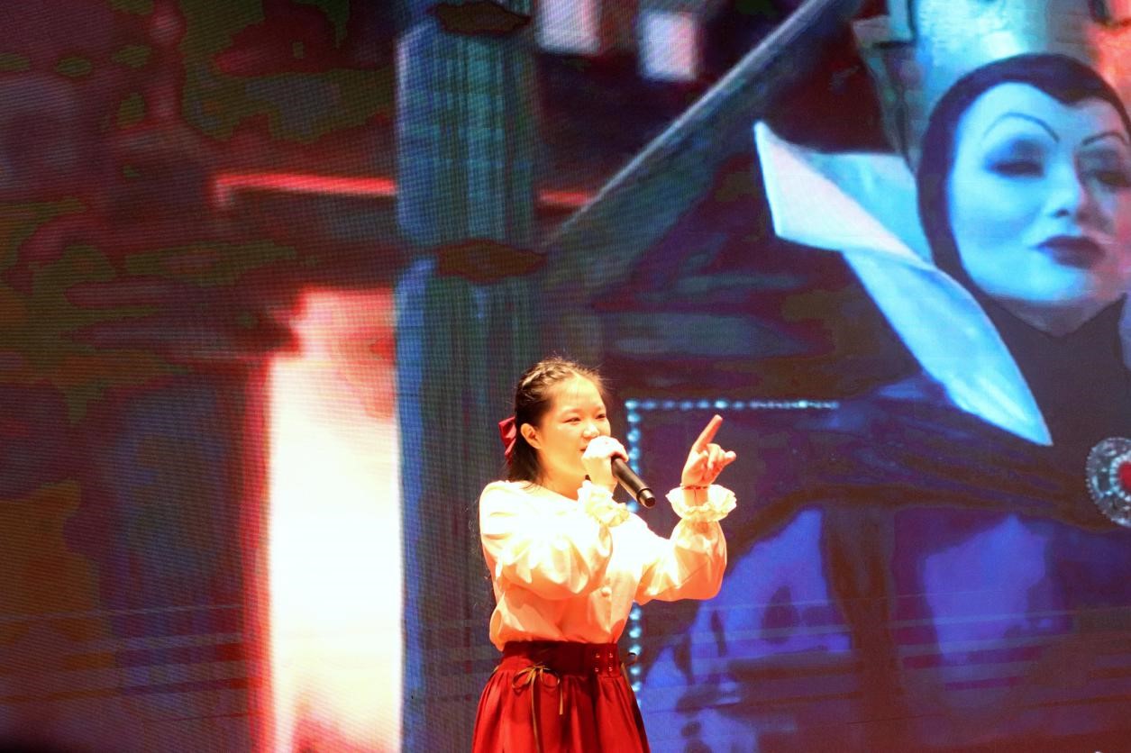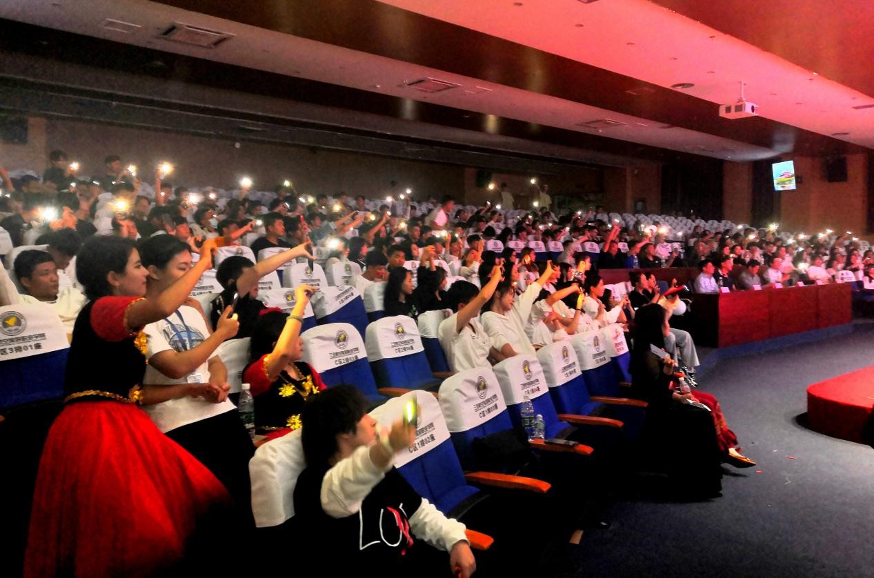 四人红歌联唱《我和我的祖国》、《我爱你中国》将全场气氛推到了高潮,同学们用手机的灯光照片了黑暗的报告厅,共同表达对祖国的热爱和祝福。
