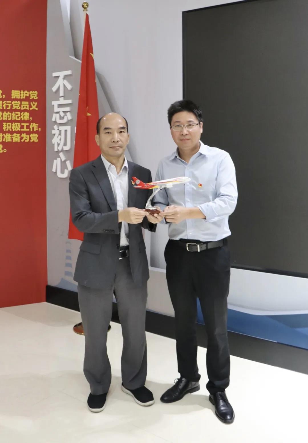 三亚航空旅游职业学院人文社科学院党支部向海南银行三亚分行党支部赠送飞机模型,双方代表合影留念。
