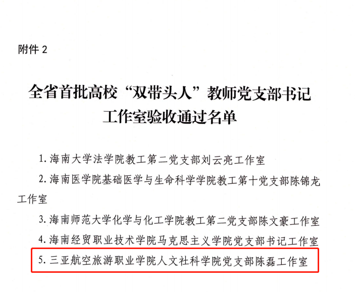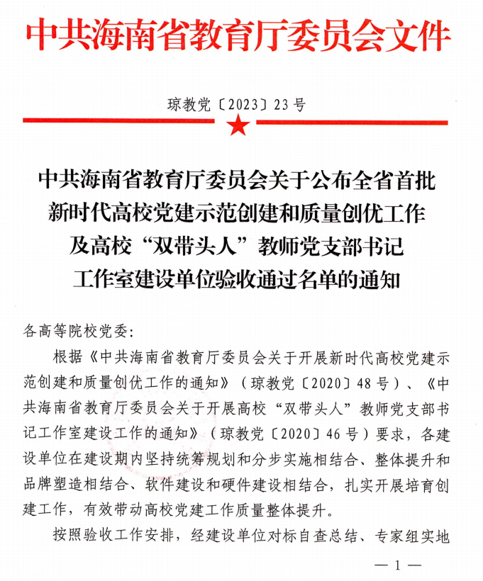 按照中共海南省教育厅委员会关于公布全省首批新时代高校党建示范创建和质量创优工作及高校“双带头人”教师党支部书记工作室建设单位验收工作安排,经建设单位对标自查总结、专家组实地考察验收、省教育厅组织答辩评审和综合审查、省教育厅门户网站公示,最终认定 3 个高校党委、5 个院系党组织、15 个党支部、5个“双带头人”教师党支部书记工作室通过此次验收。