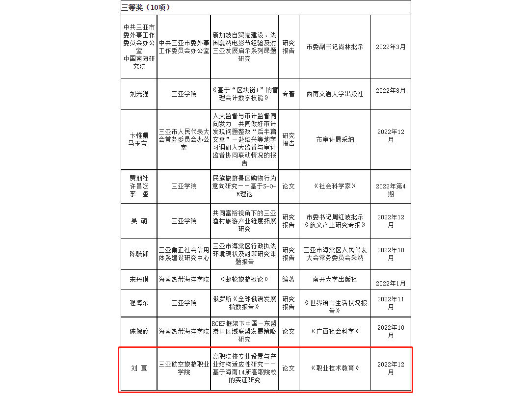 近日,三亚市2022年度哲学社会科学优秀成果评选结果发布,我院信息技术系主任刘夏教授申报的成果“高职院校专业设置与产业结构适应性研究——基于海南14所高职院校的实证研究”获得三等奖。