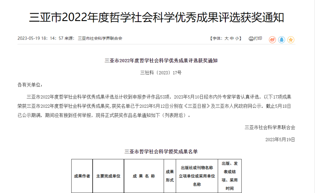 图:三亚市2022年度哲学社会科学优秀成果评选结果