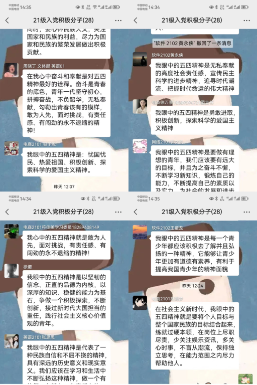 活动中,同学们重温历史、学习英模、抒发情怀、憧憬未来,并纷纷提交学习“五四”精神活动感想。