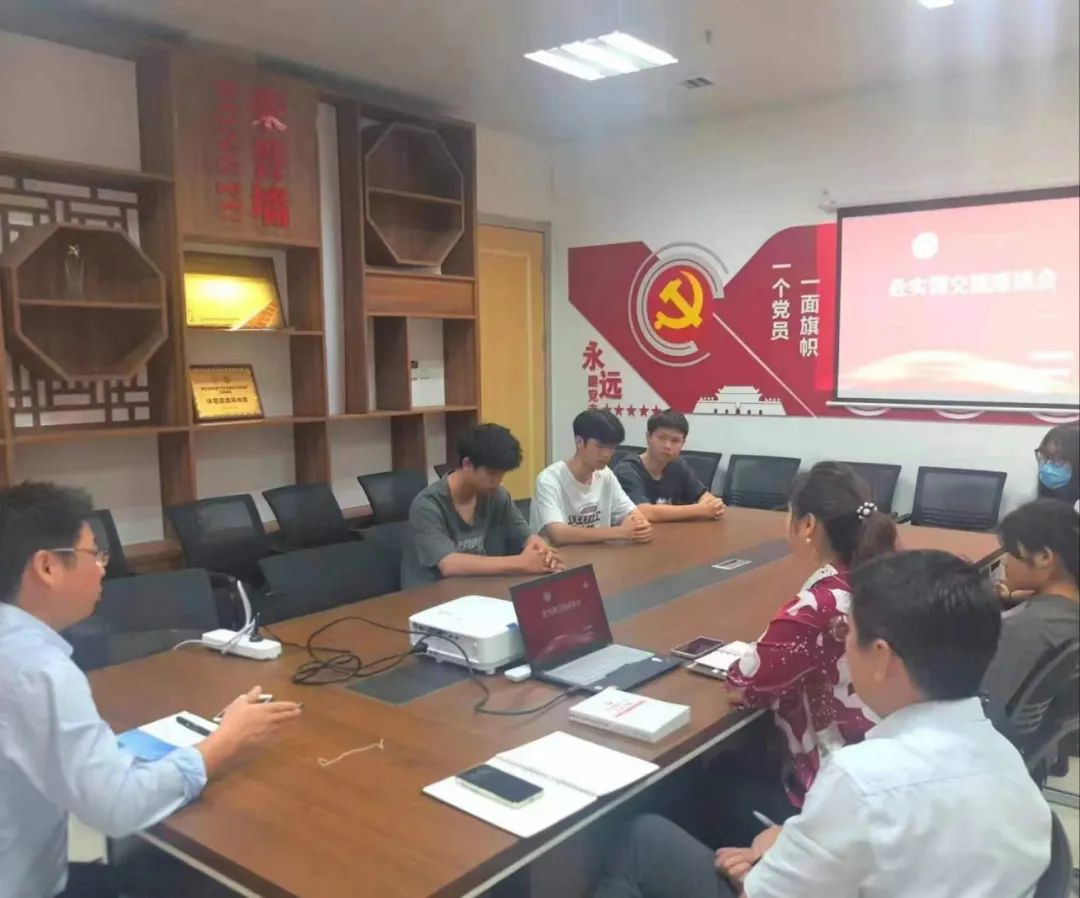 为深入学习贯彻习近平新时代中国特色社会主义思想,推动主题教育走深走实,同时更好了解同学们思想动态,就业需求,人文社科学院“双带头人”教工党支部于6月14日开展赴实训前座谈交流会。出席本次座谈会的有党支部书记陈磊,副书记刘亢,宣传委员李雪,实习负责老师姜苏洋及21级各专业学生代表。