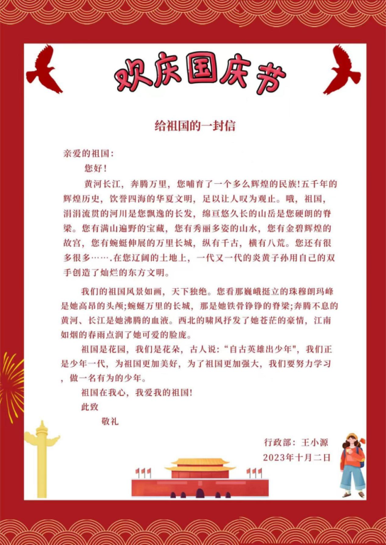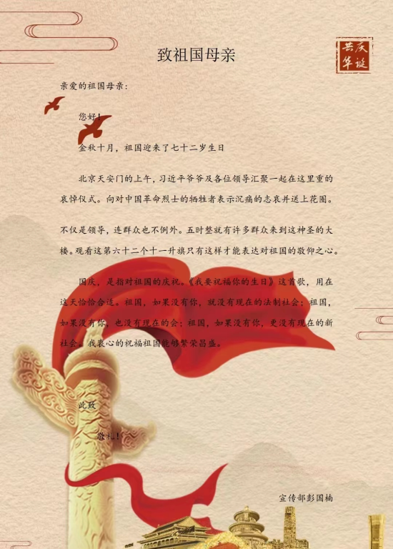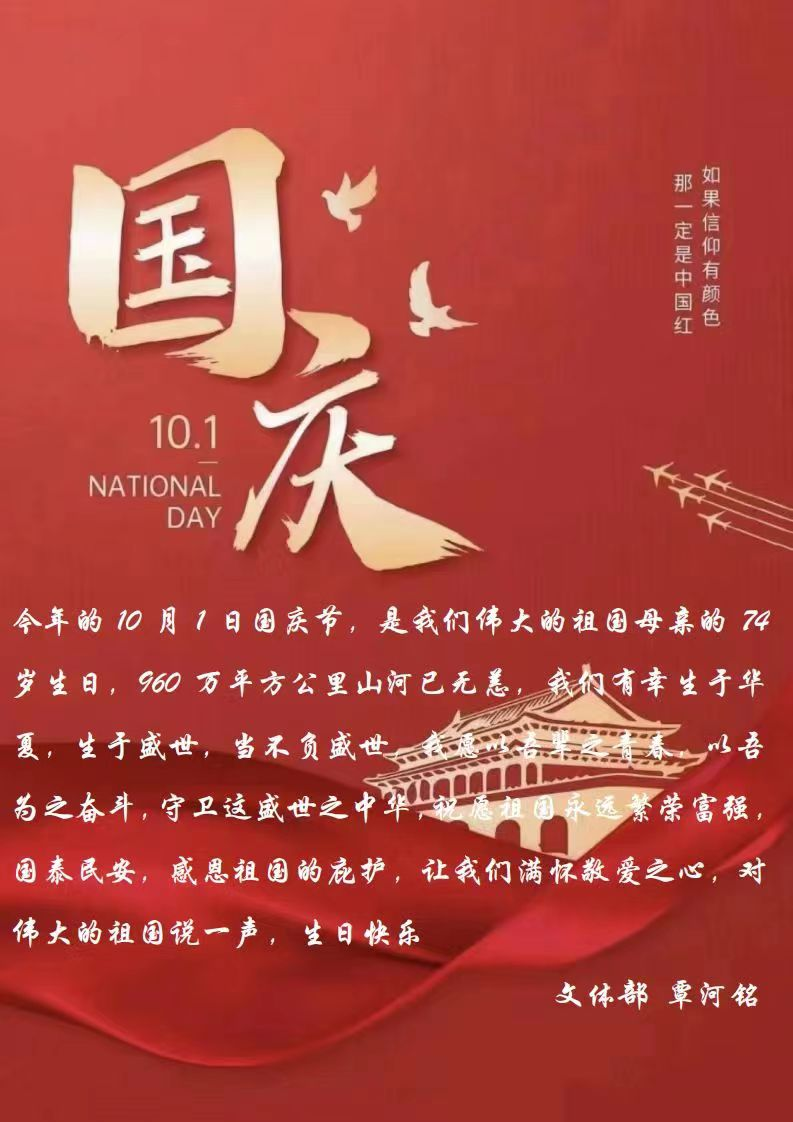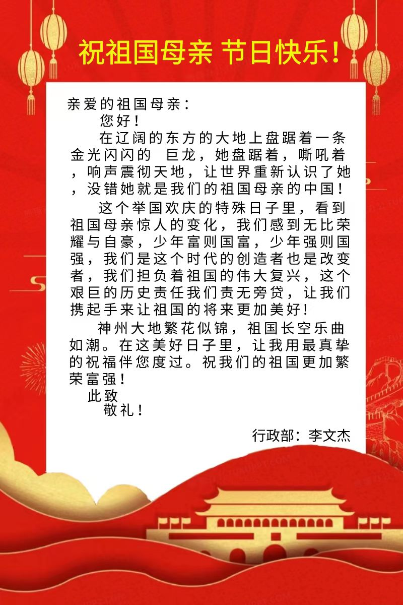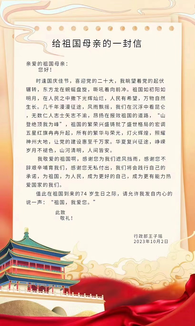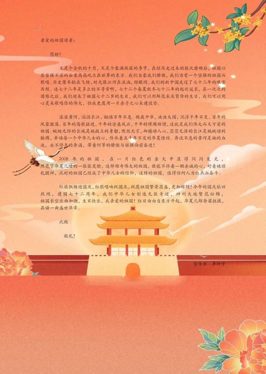 国庆中秋双节合璧,我们迎来了祖国74盛世华诞。弘扬我国传统文化、传统节日,丰富学生生活,营造热烈喜庆、文明和谐的节日氛围,同时激励学生为中华之崛起而读书。人文社科学院双节假期开展 “给祖国母亲写封信”的国庆、中秋双节主题活动。